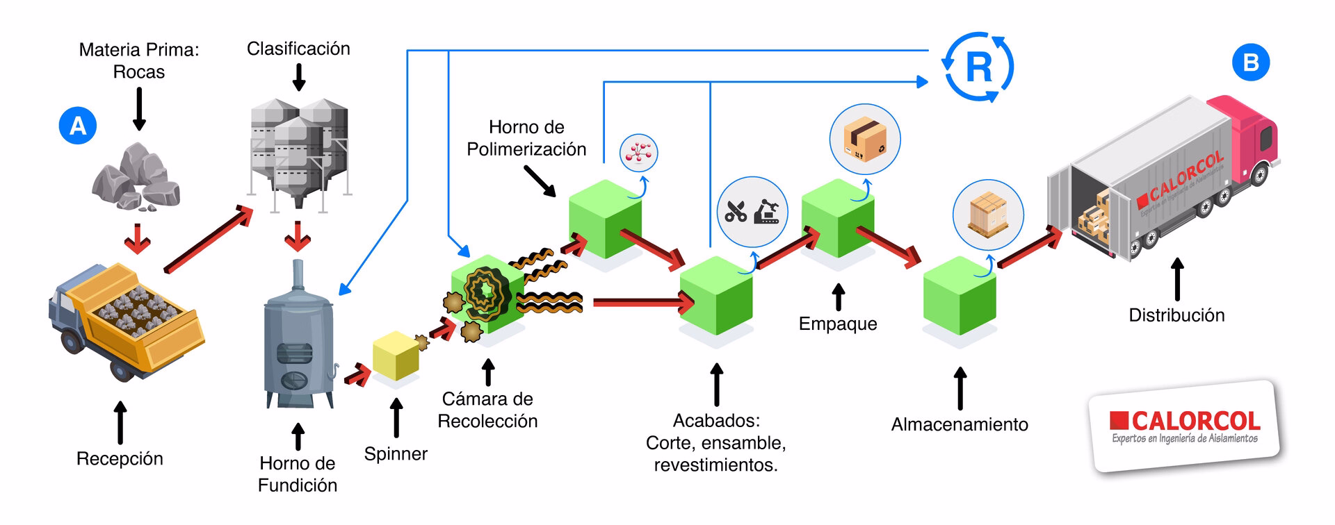 CALORCOL manufactura mediante un proceso exclusivo la Lana Mineral de Roca, la cual está constituida de finas fibras inorgánicas, que son procesadas a partir de rocas en estado líquido, formando una masa suave de fibras largas entremezcladas unas con otras, de peso ligero y con mucho cuerpo, que se caracterizan por su baja conductibilidad térmica, excelente absorción acústica y resistencia al fuego.
